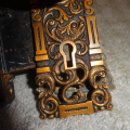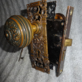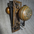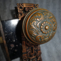 Antique bronze door set in excellent condition that can be installed on either side of door, has a heavy duty mortise lock that was cleaned and oiled. Backset is 2-1/2” [measurement from center of knob to face of lock]