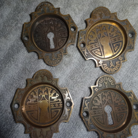 Double pocket door sets come with four door pulls, or plates and two locks. A single set will have two pocket plates and one lock. A few of the fancier sets have curved astragal lock fronts. These old pocket locks were taken apart, cleaned and lubricated, the pop-out handles all operate as new and should be trouble free for many years. As seen in pictures most all pieces retain their original finish and are in exceptional condition.