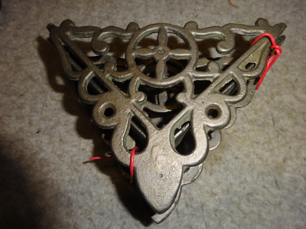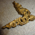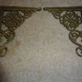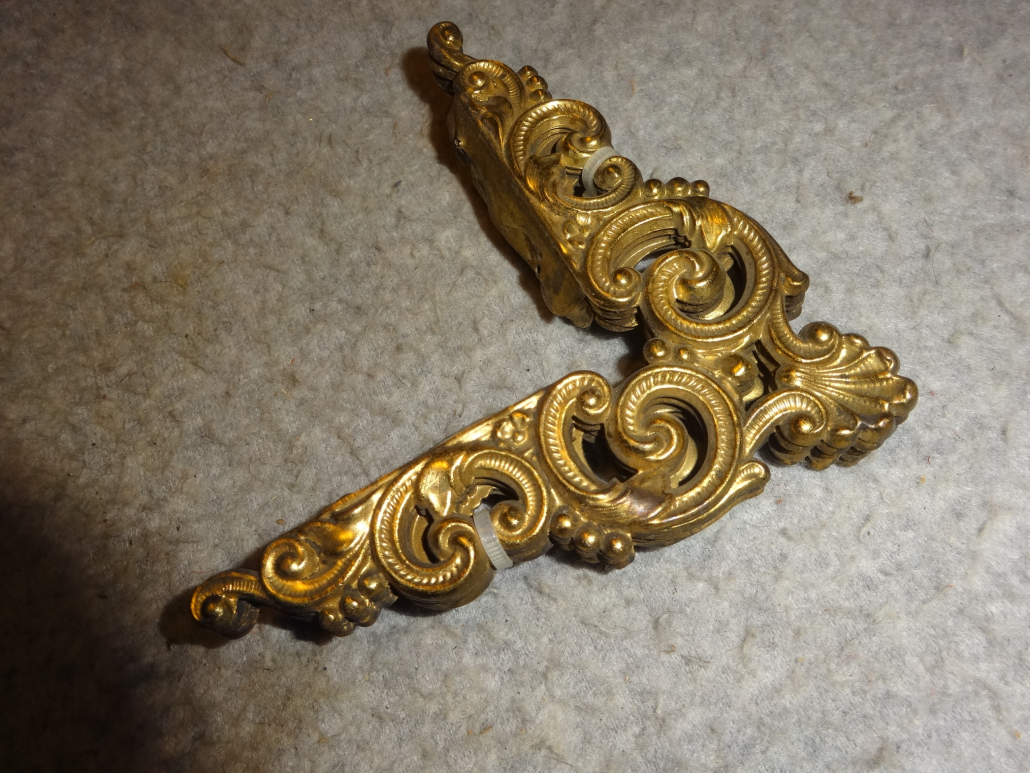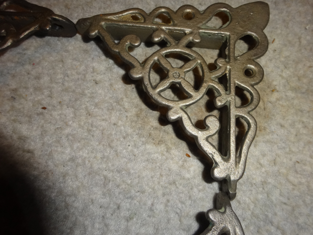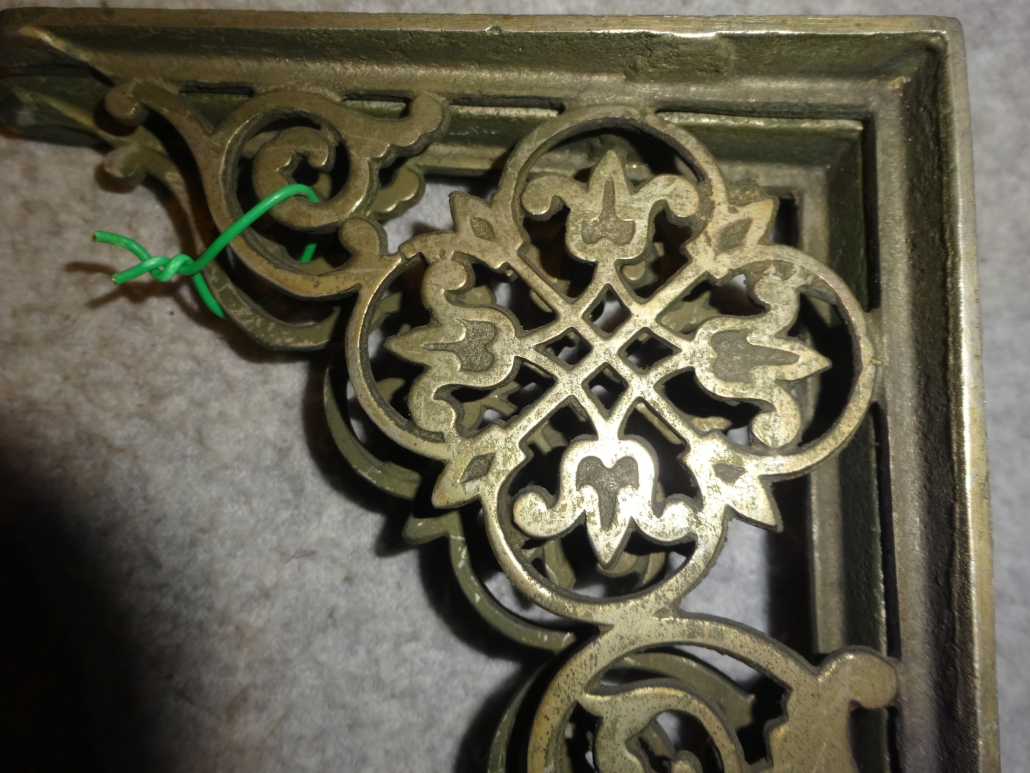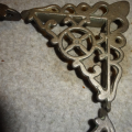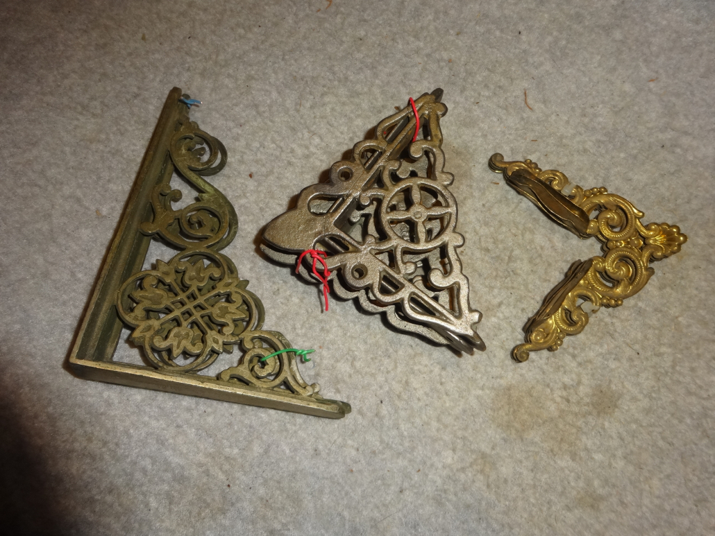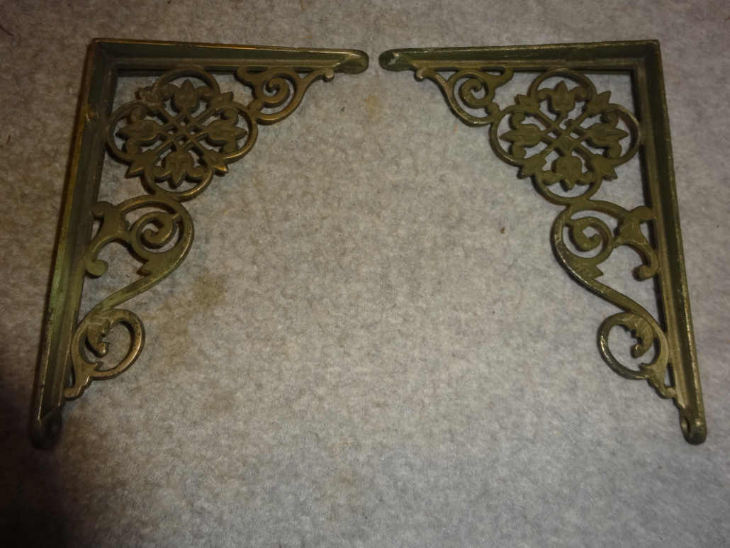 Three groups of original brackets, pair of old brass shelf brackets with tulips nice quality would look sharp after cleaned, appear to have a silver coating. There are 4 old decorative cast iron screen door corner brackets, used for securing a loose door, are heavy duty. 4 fancy stamped brass jewelry box corner brackets.