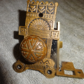 This set was put together from original antique bronze door hardware to custom fit a Victorian screen door. Two rare style triangular door plates with owls made by Peterboro. Two original screen door knobs, rare tiny original mortise door lock with keeper and spindle {NOS} to fit knobs that adjust to fit a screen door from 5/8” to 7/8” thick. All fit together and work well. Door plates are 3-3/4” x 2-3/8” Mortise lock 1-3/8” deep x 1-3/8” high x 3/8” thick. Has a 1”back- set {measurement from middle of knob to lock face}