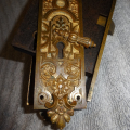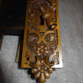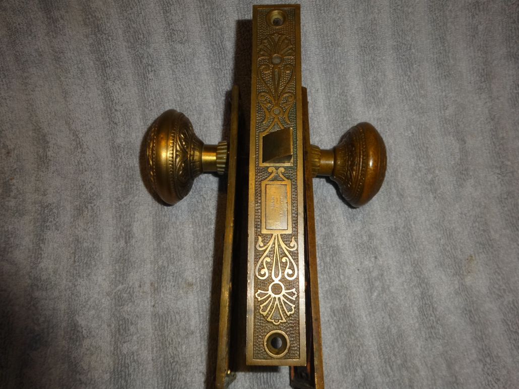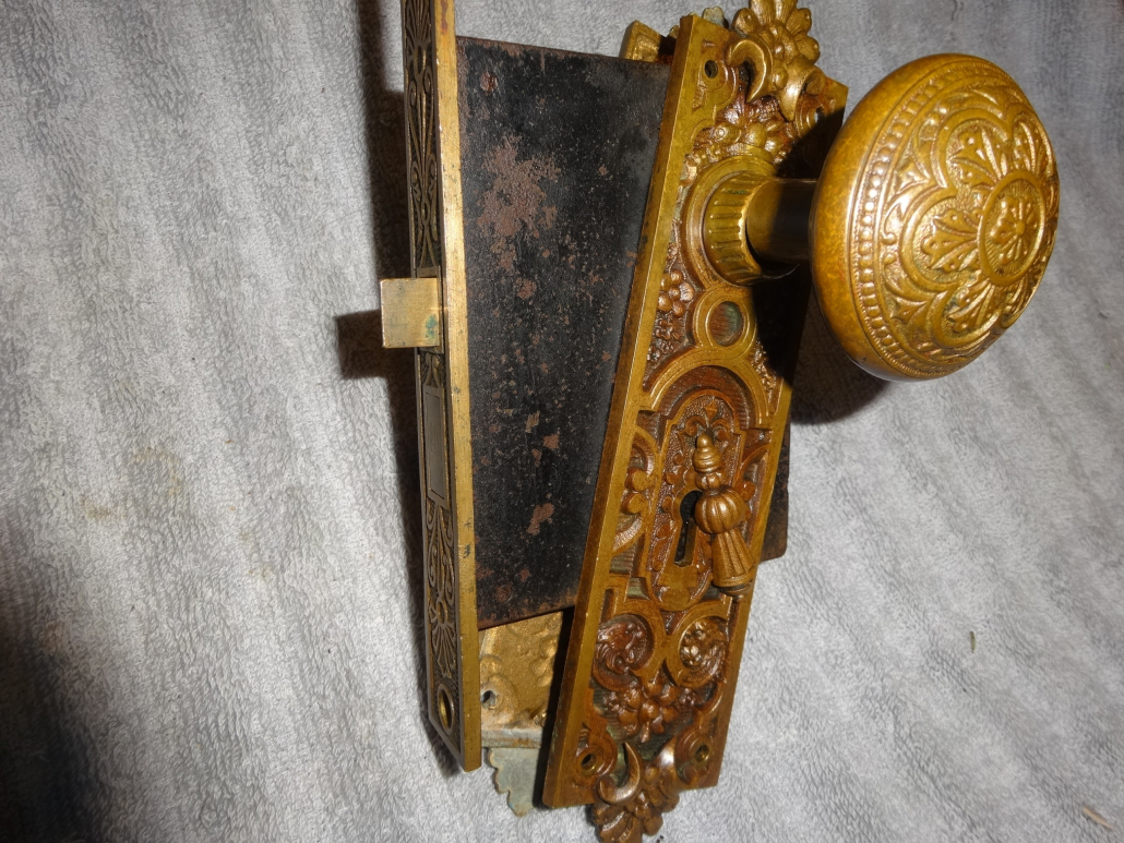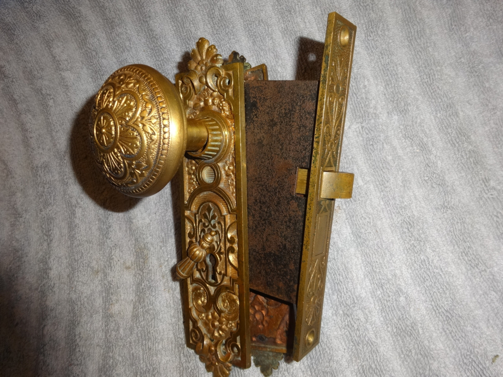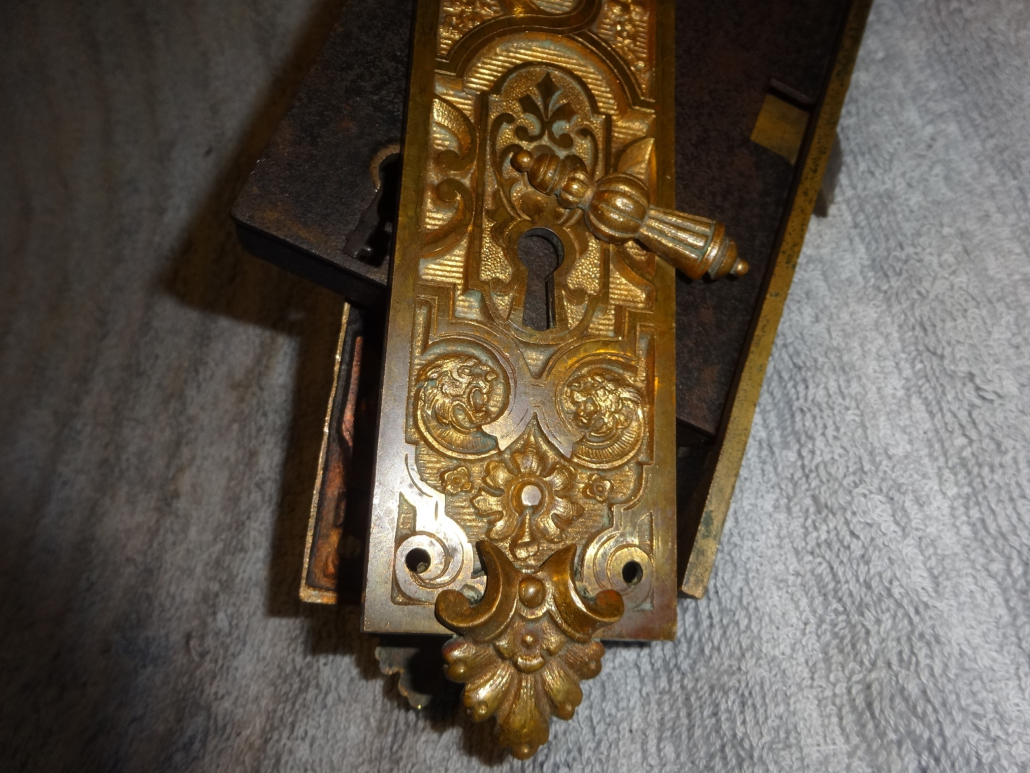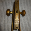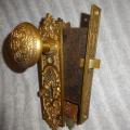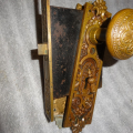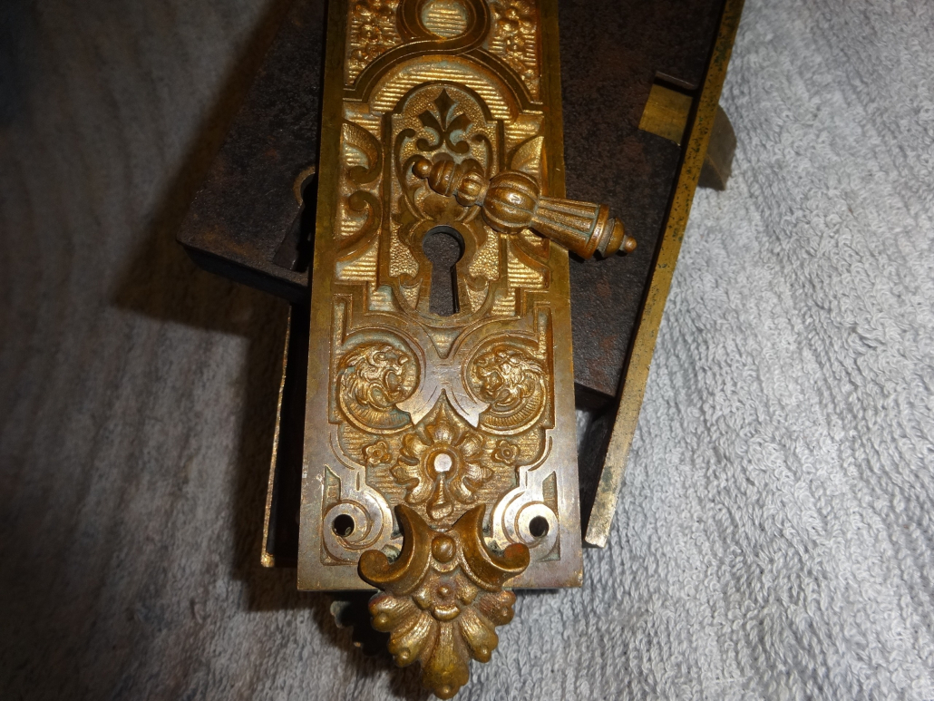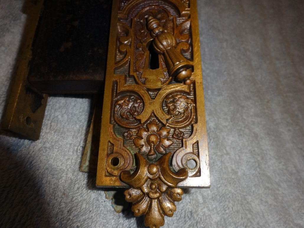 Original door set in excellent condition with both entry and passage size knobs. Two hard to find full size decorative door plates containing lion heads retaining their swinging key covers. Heavy duty mortise lock with a fancy bronze face and good working latch, locking section is intact but key is long Mortise lock has reversible latch and set can be mounted on either side of door.