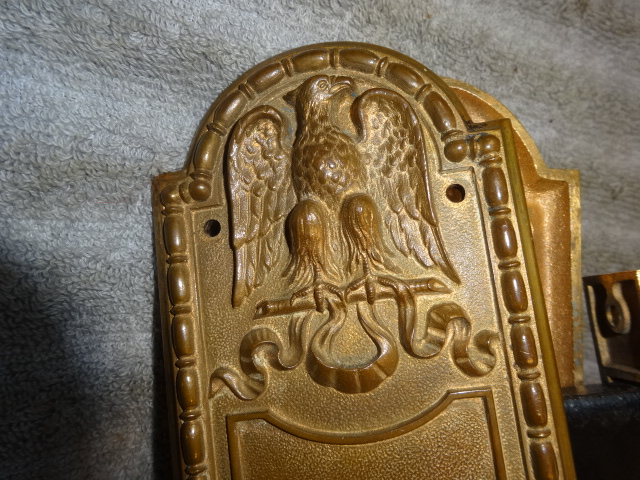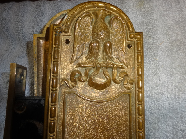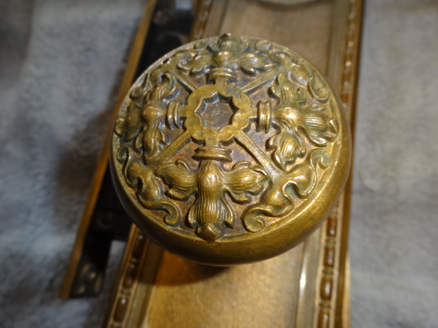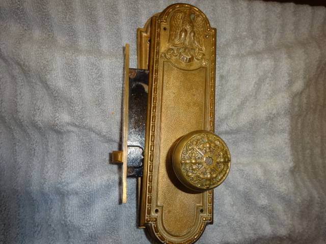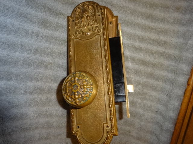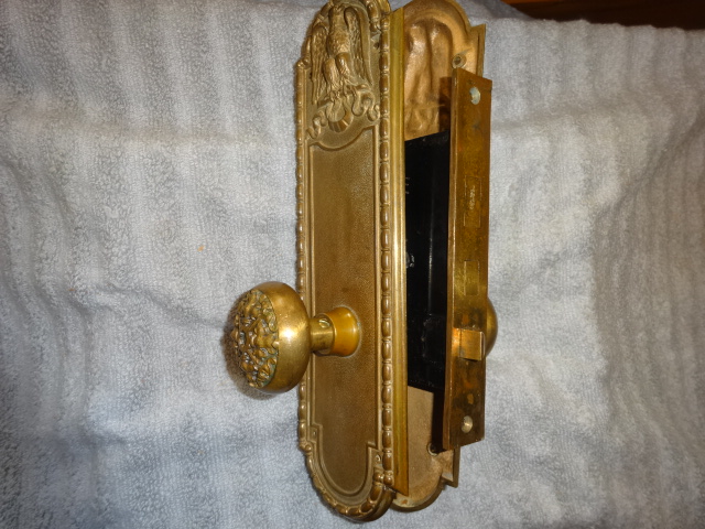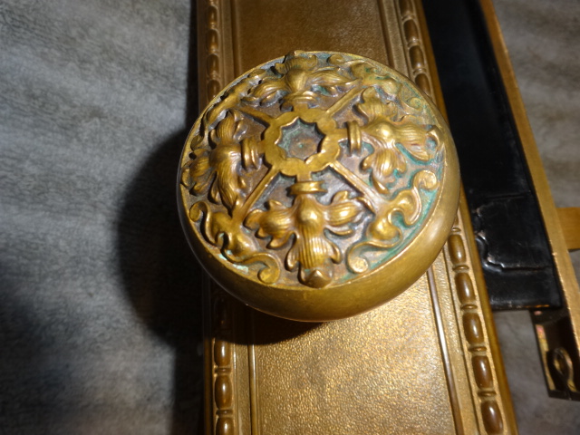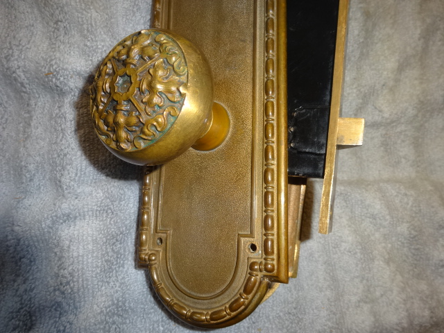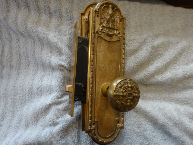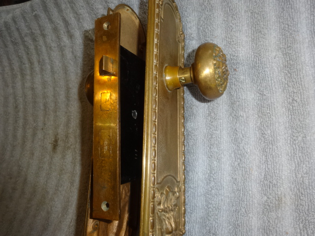 Large heavy duty bronze door set that was most likely used in conjunction with a separate dead bolt or used on a large Victorian interior door as a passage set, has a large mortise lock with a good working reversible latch that can be mounted on either side of door. As seen in pictures set has very little if any wear in near perfect condition with original golden finish.