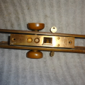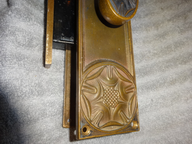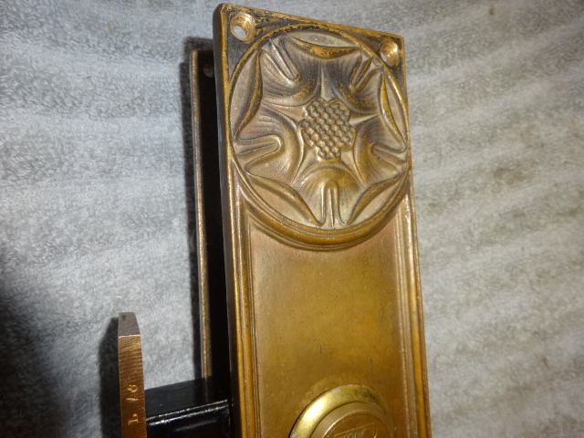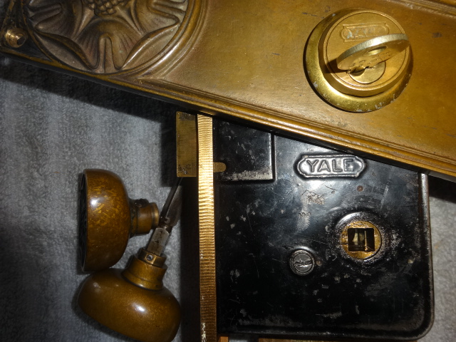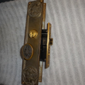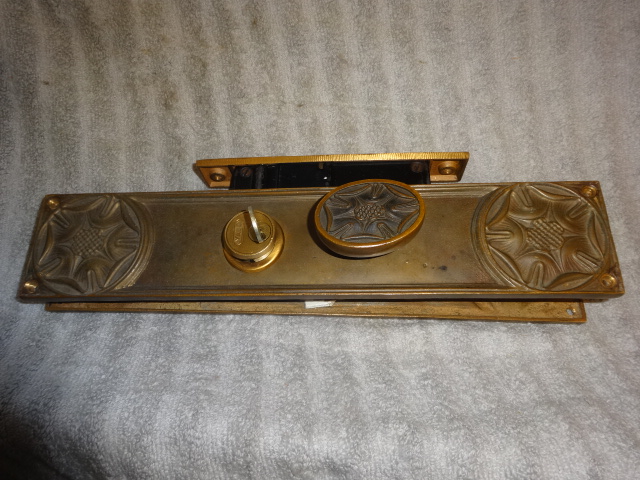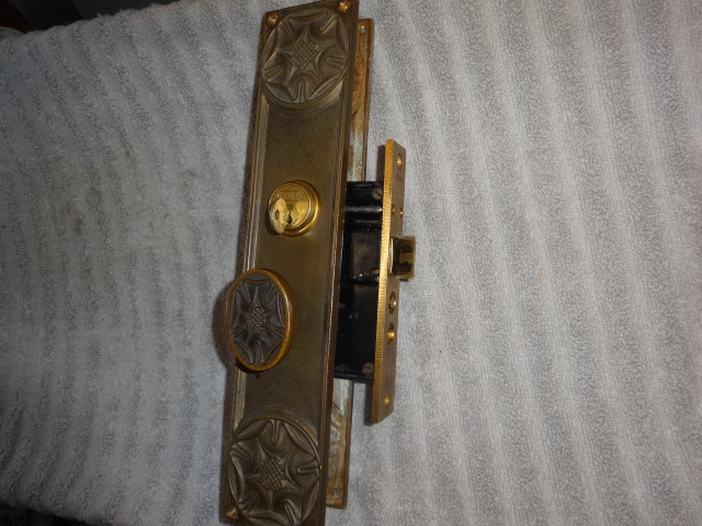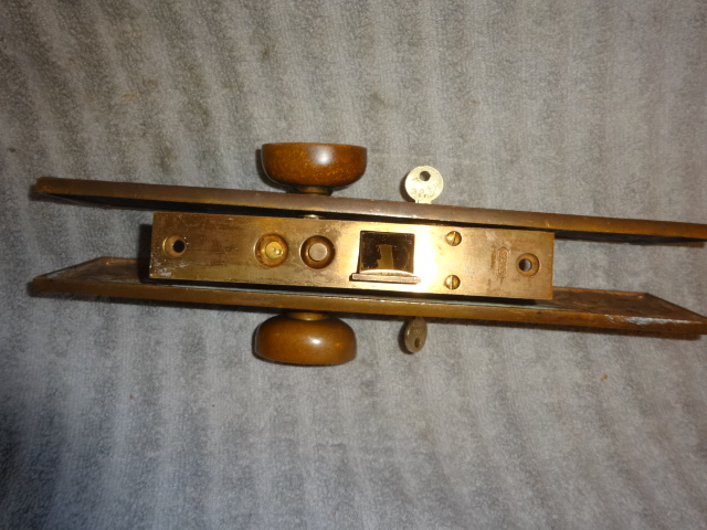 Seldom seen original matching door set in amazing condition both inside and out with keyed alike double cylinders. Mortise lock has the ex-wide size latch with pre latch designed for a smoother operation. Set mounts on right side of door when facing front with door swinging into room. Both cylinders and knobs easily adjust to fit a door from 1-3/8 to 2”thick. Has a 2-5/8” backset {measurement from middle of knob to face of lock} Operation: with push buttons in locked position key unlocks door from either side.