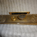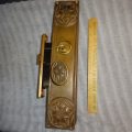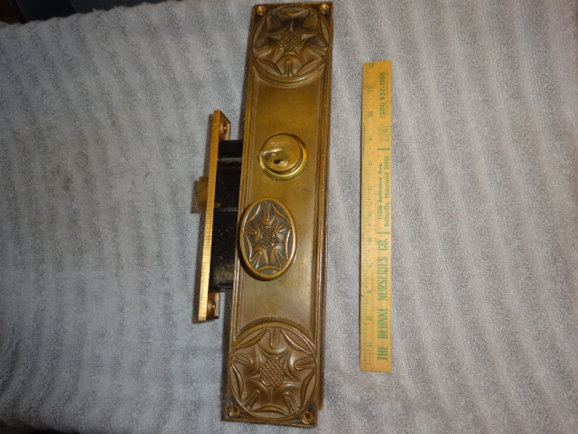Face of mortise lock measures 7-3/4”x 1-1/4” x ¼” Lock body is 5-1/2” high x 3-1/2”deep x 1-1/16” thick. Both jumbo size door plates are 3” x 15” Entry doorknobs 2-1/2” Set weights 10 Lbs. Will be packed to survive and fully insured.
