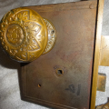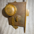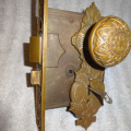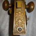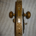 Hard to find heavy duty entry set for a large Victorian door, has an over the top mortise lock in perfect condition. Door set mounts on left side of door when facing front with door swinging into room. High end mortise lock was designed with a split style locking hub and spindle. Operation: with lever on face of lock in locked position the outside knob locks and can’t be turned still allowing the inside knob to turn and open door similar to a night latch. The key operates the throw bolt from the outside. The knight latch operates the throw bolt from inside, the small key escutcheon is added for decoration only. All pieces are in amazing condition inside & out. Has a 3” back-set {measurement from middle of knob to lock face} Mortise body is 5-3/4” high x 4-1/8”deep x ¾” Lock face is 8-1/2” x 1-1/4”x ¼” Entry plate is 8”x 2-3/4” Rosette 2”dia. door knobs are 2-1/4” and 2-1/2”