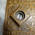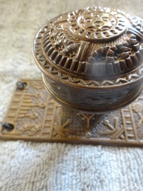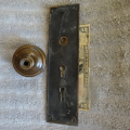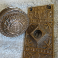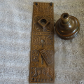 Matching bronze entry set with large double keyhole plate, key cover and entry knob with decorated rim.