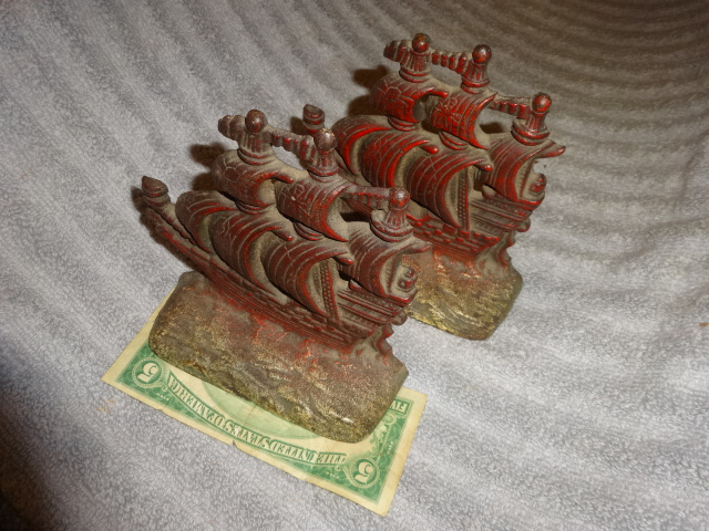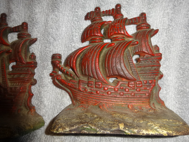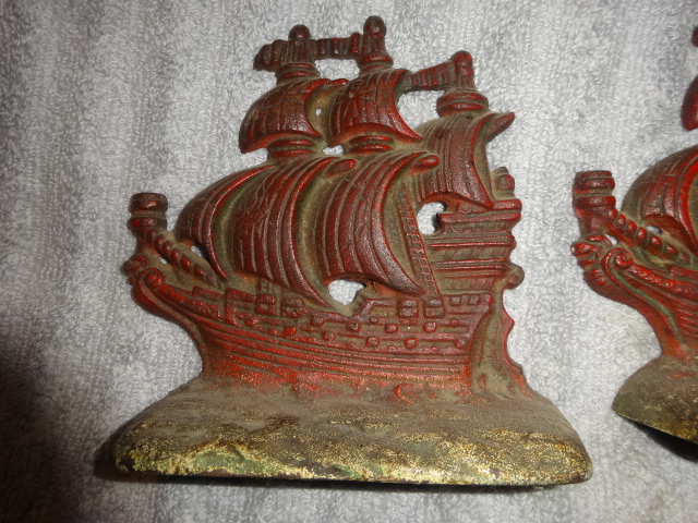 Pair of cast iron pirate ship bookends retaining original old paint with number 381 stamped on back. Measure 6” high x 6” wide