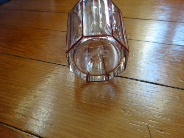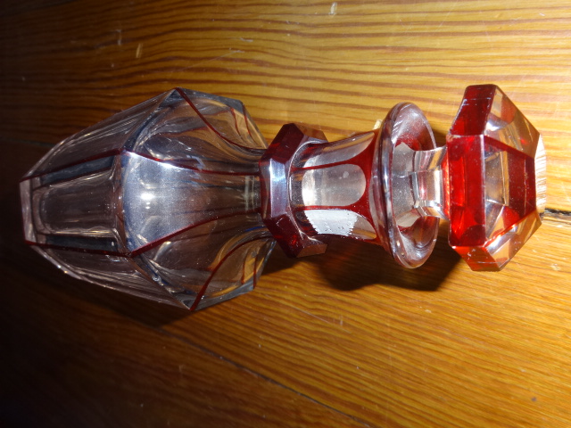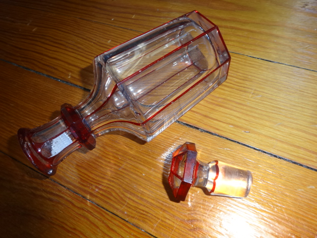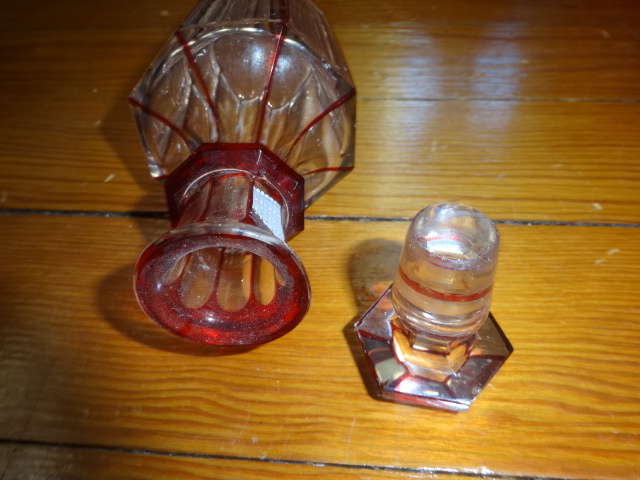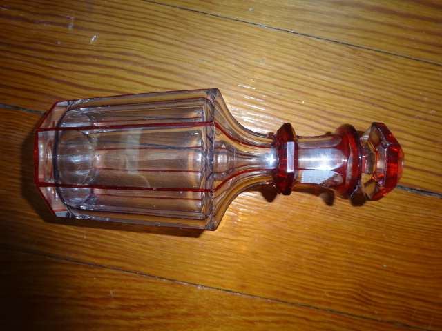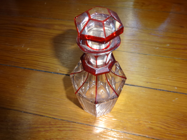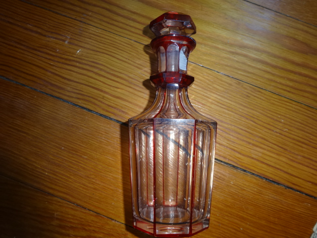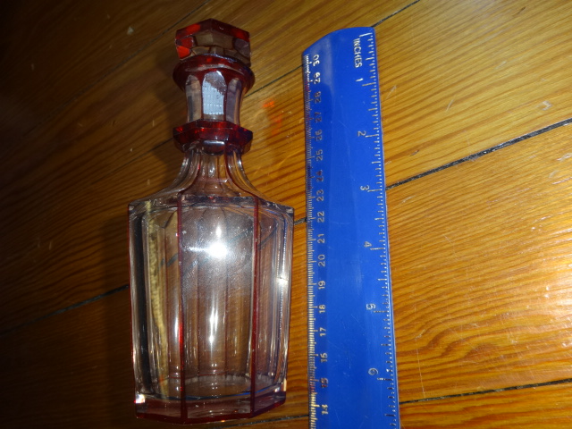 Here is a beautiful old hand cut crystal bottle with no haze that was hand blown with an applied ring on neck free from cracks, chips or damage in exceptional condition with its original ground glass stopper that fits tight. Would make a perfect weekend decanter, this highly decorative style doesn’t surface often. Measures 7” x 3”