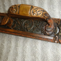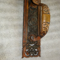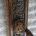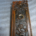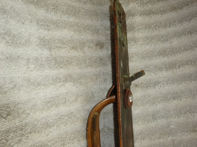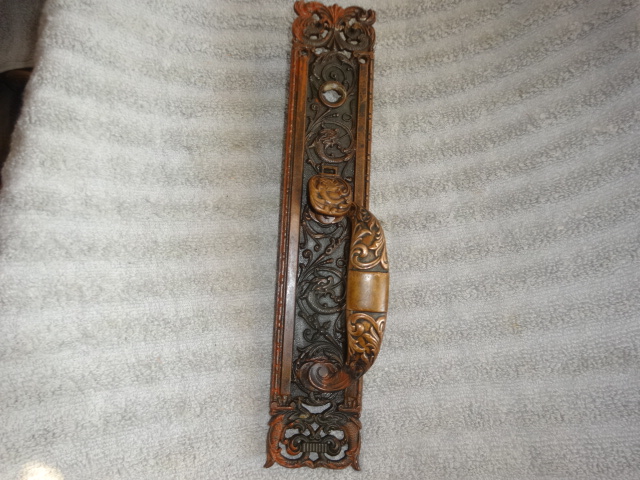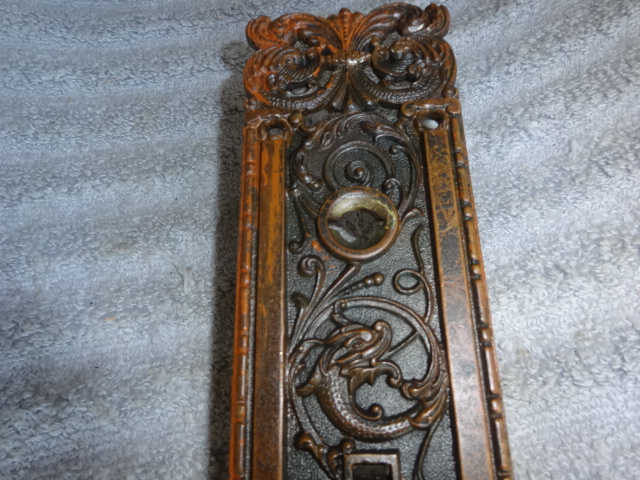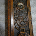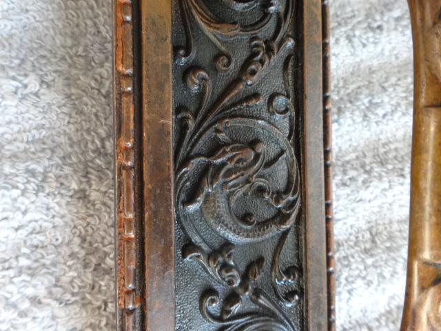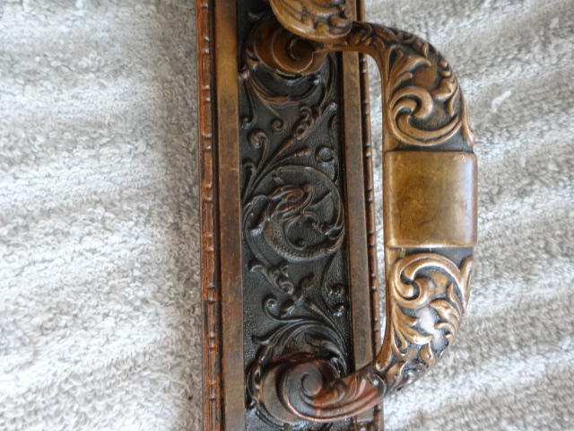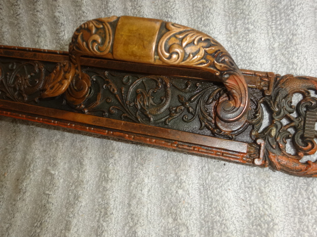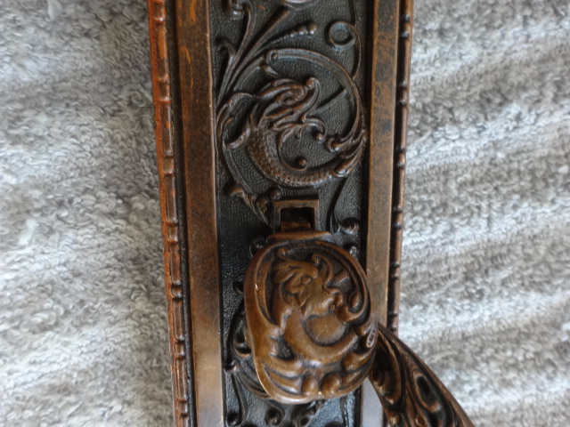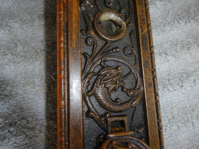 Hard to find original bronze door pull filled with highly detailed mythical creatures intertwined in the scrolling. Thumb latch is a plus retaining most of the figural design on latch face which normally is worn away. Has a good latch lever on back. Measures 14” x 2- ¾”