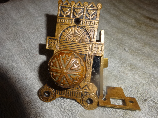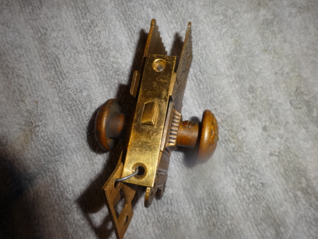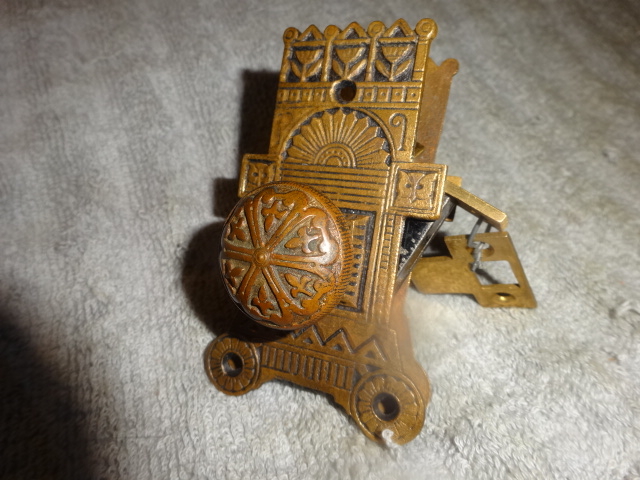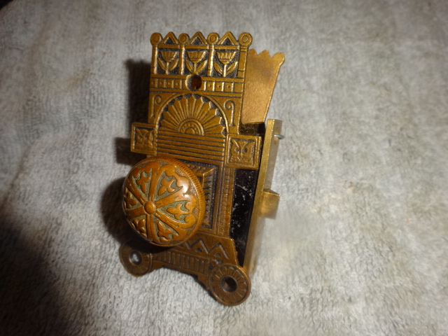 This set was put together from original antique bronze door hardware to custom fit a Victorian screen door. Two rare style triangular door plates with owls made by Peterboro. Two original screen door knobs, rare tiny original mortise door lock with keeper and spindle {NOS} to fit knobs that adjust to fit a screen door from 5/8” to 7/8” thick. All fit together and work well. Door plates are 3-3/4” x 2-3/8” Mortise lock 1-3/8” deep x 1-3/8” high x 3/8” thick. Has a 1”back- set {measurement from middle of knob to lock face}