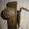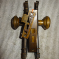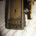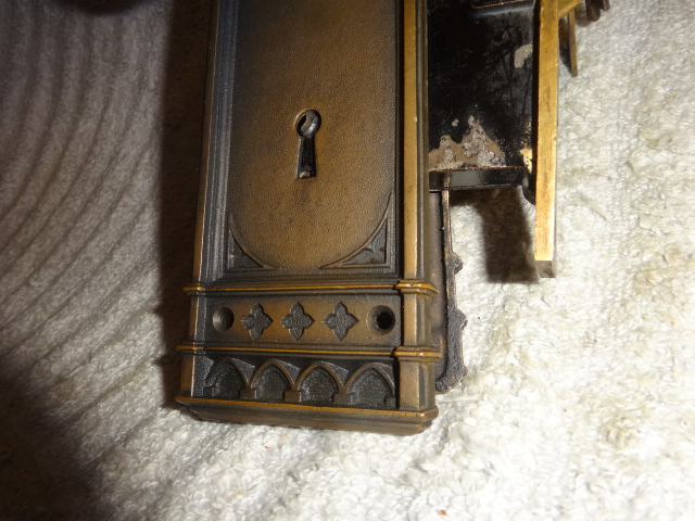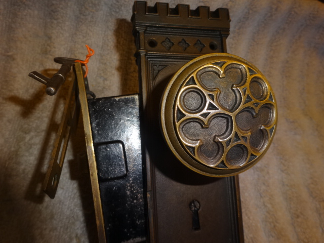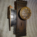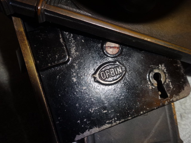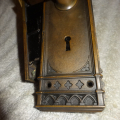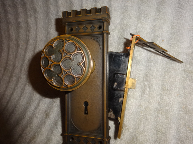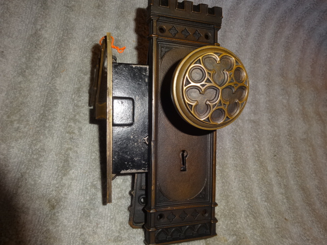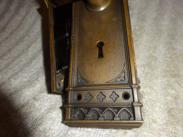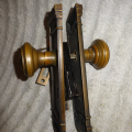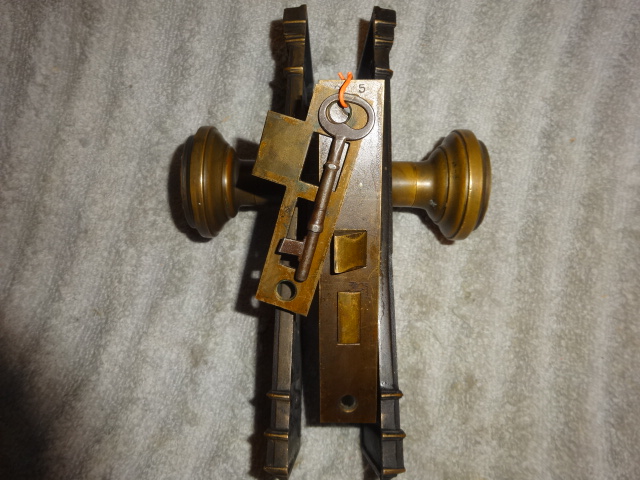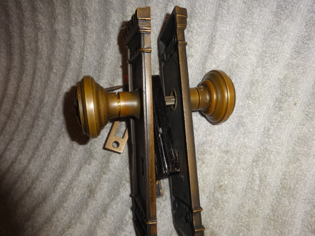 Hard to find high quality matching bronze lock-set in amazing condition that can be installed on either side of door by flipping latch. Has a 2-1/2” back-set {Distance from center of knob to lock face} Mortise lock body is 3-5/8” high x 3-1/8” deep x ½” Lock face 5-1/2” x 1”x 1/8” Both back plates measure 8-1/2” x 2-1/2”x 3/8” Knobs are 2-1/4” Strike plate 3-3/8” x ¾” to 1-1/2”