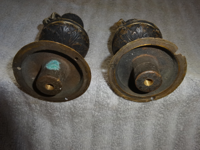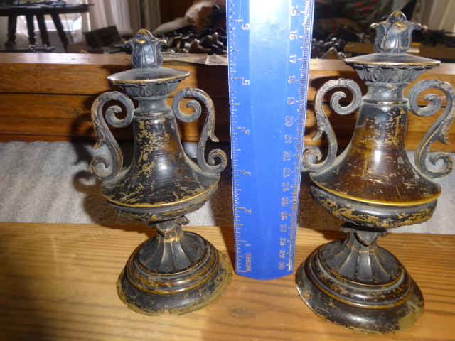Matching pair of over the top heavy bronze antique finales with original old finish. Weigh 3lbs.each with a threaded 5/16” hole in center for mounting.