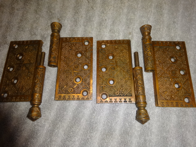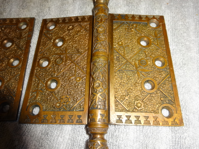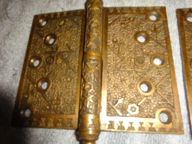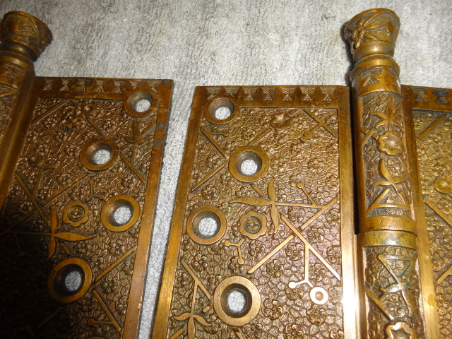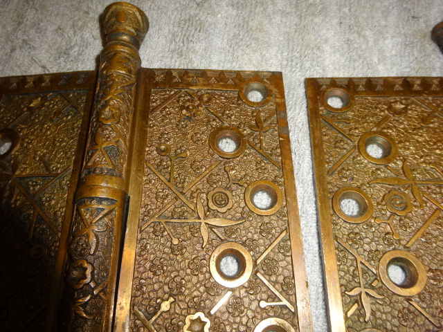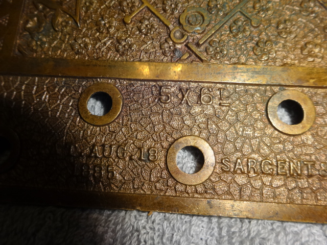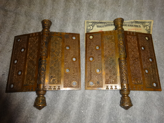 Large matching slip-off style hinges both marked Sargent & Co. Aug. 18 1885 5”x 6” “L” These would mount on left side of door when facing front with door swinging into room. Both fronts and backs are in amazing unblemished condition without any pivot wear