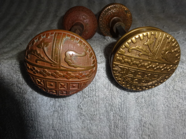 Two pair of different style door knobs by Sargent in similar pattern variations, one domed other drum style
