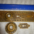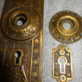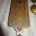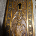 Large finely detailed antique bronze door plate, rosette and key cover dated Sept. 7 1886