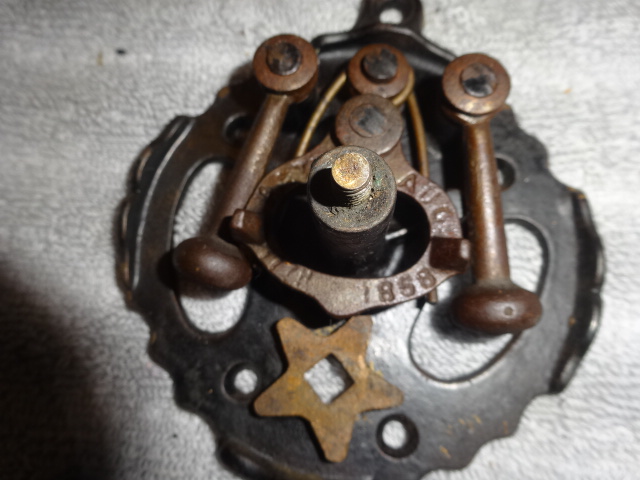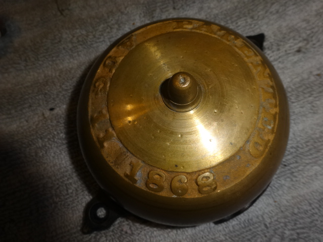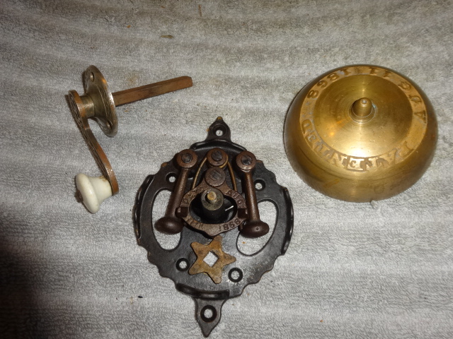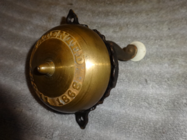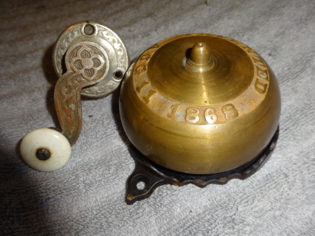 High quality original crank type doorbell with double ringer, when turned one revolution it rings 4 times with a loud and clear ring tone in excellent original condition. Bell measures 4” in diameter mounting holes are 4-3/4” on center, ringer is 4-3/4” long with a 2” back plate and 1” knob. Will fit doors up to 2-1/2” thick or smaller. This early style doorbell was well designed and made to last.