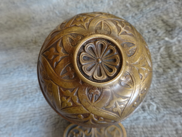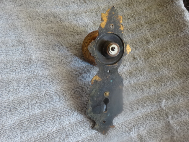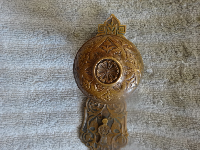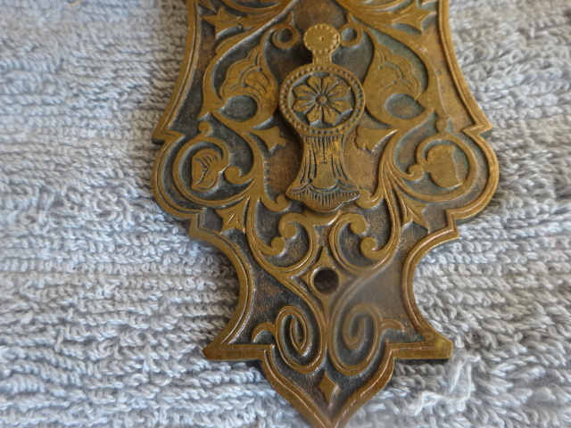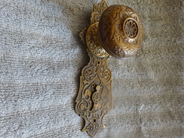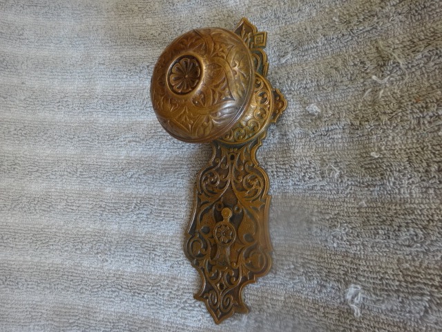 Hard to find bronze entry knob with door back plate in excellent condition. Door plate measures 8” x 2-3/4”.