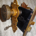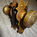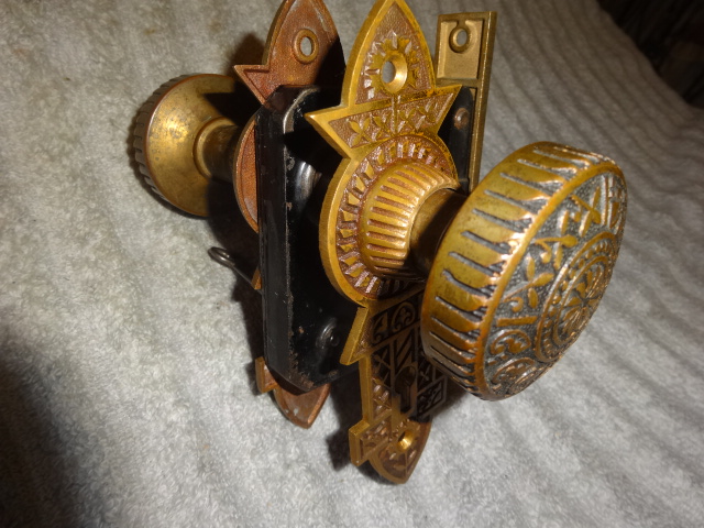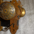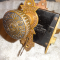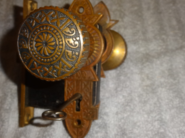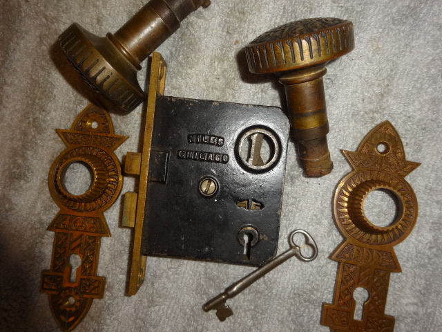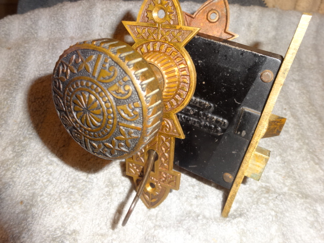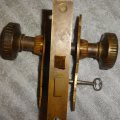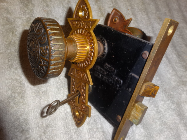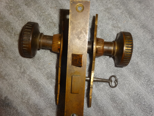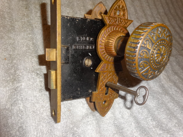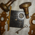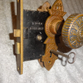 Perfect working decorative lock set with original finish that will mount on either side of door, has a good working key from both sides. Back set measurement is 2-1/2” {distance from middle of knob to lock face} Body 3-1/2” high x 2-3/4” deep x ½” Lock face 5-3/8” x 7/8” Door plates are 6” x 1-3/4” Knobs are 2-1/4”