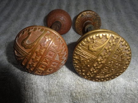 Two pair of different style door knobs by Sargent in similar pattern variations, one domed other drum style