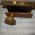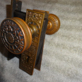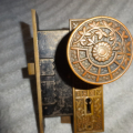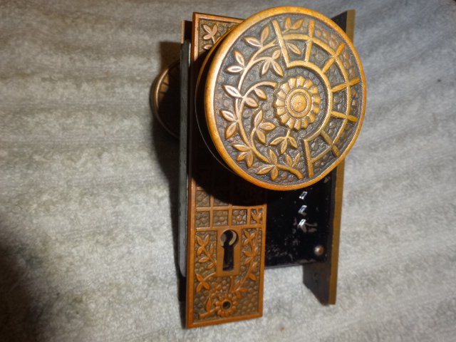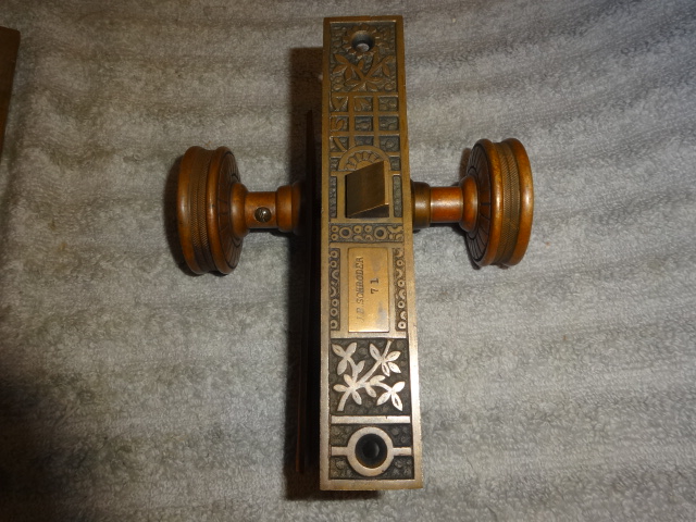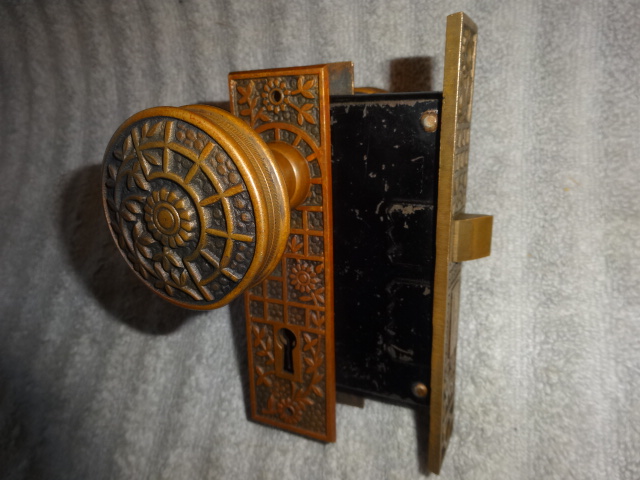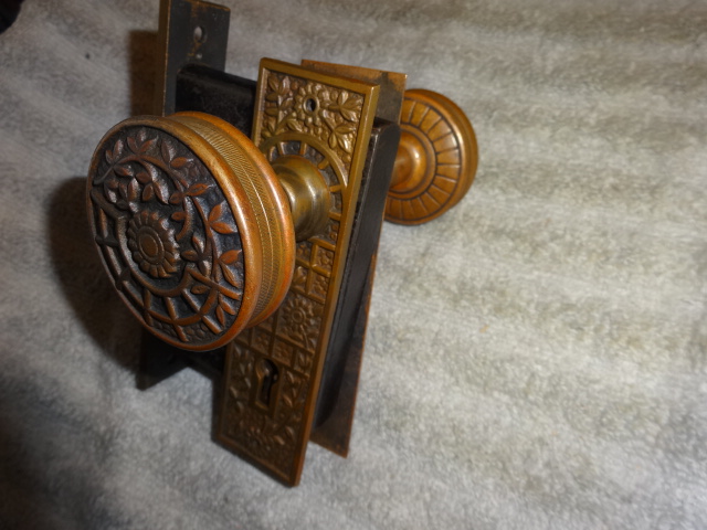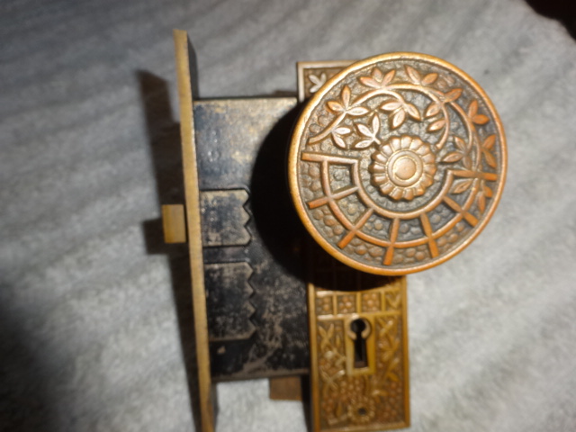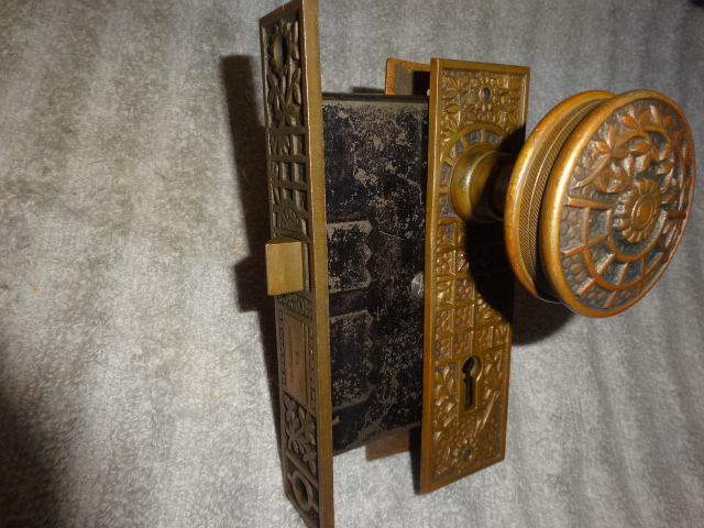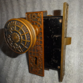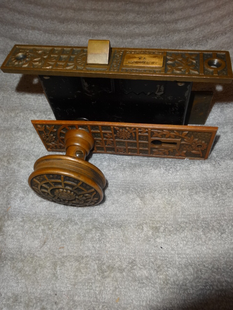 Antique bronze passage door set with an exceptional mortise lock marked Schroder.