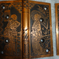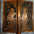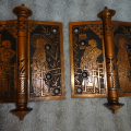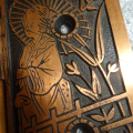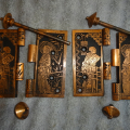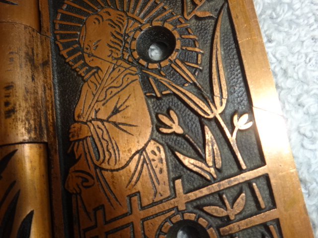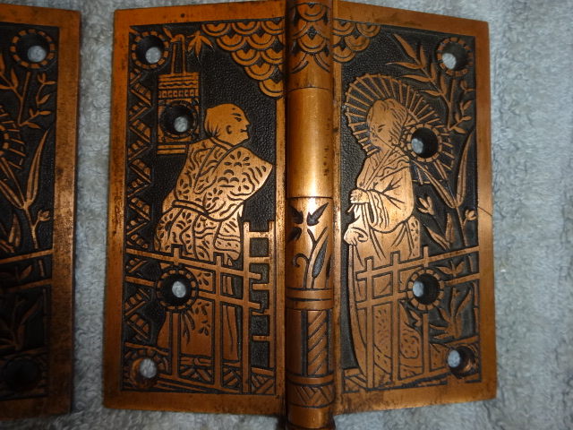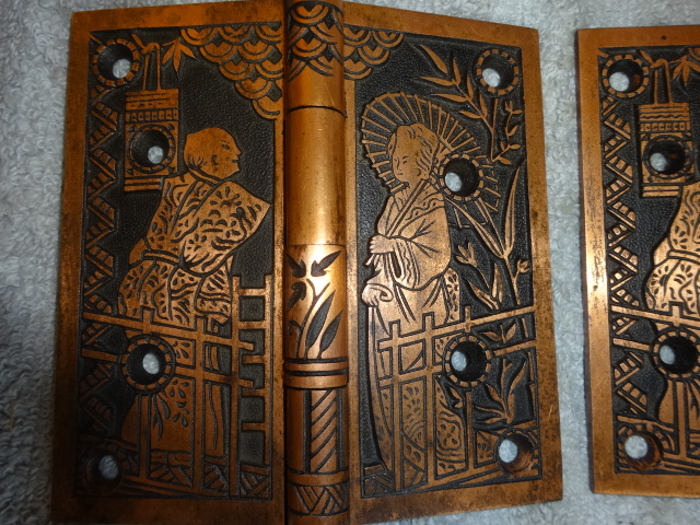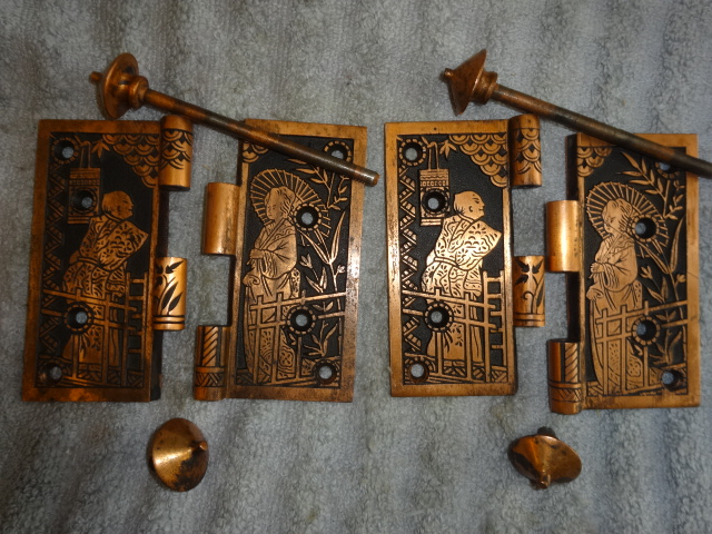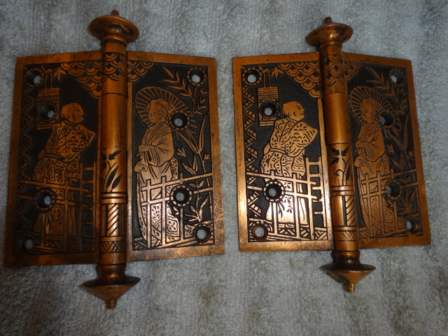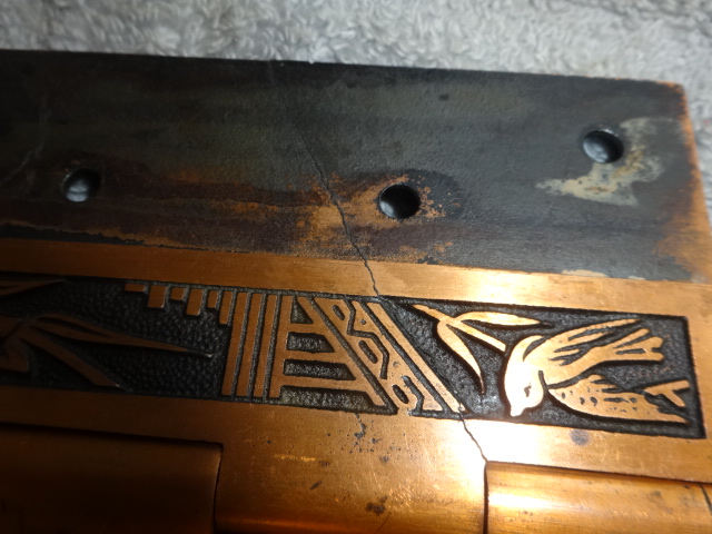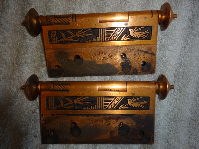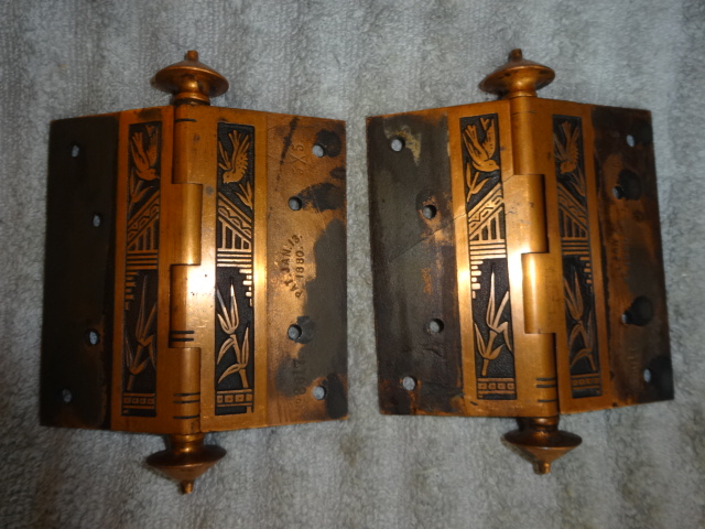 These are beautiful hinges that display well, this style is very hard to find still retaining their original finish. Unfortunately one of the hinges on the right side was cracked and professionally repaired with super glue, it’s not noticeable and hard to see even under magnifacation. If installed properly most likely could be put back to use on a door. There are three close up pictures showing the crack. They measure 5” x 5”