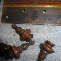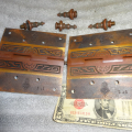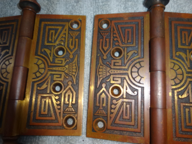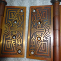 Bronze hinges with fancy steeple finales in excellent condition with original finish free from pivot ware, these will mount on either side of a door from 1-1/4” to 1-3/4” thick