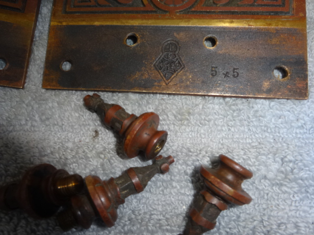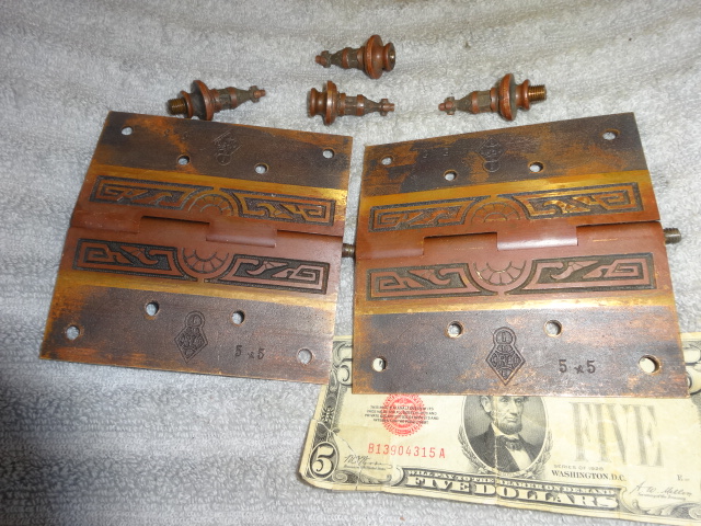Pair of heavy duty original bronze door hinges marked 5×5 with R&E’s logo on backs c.1885