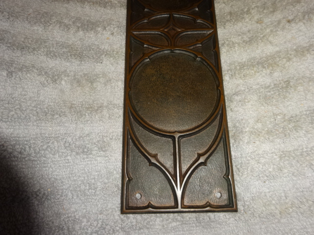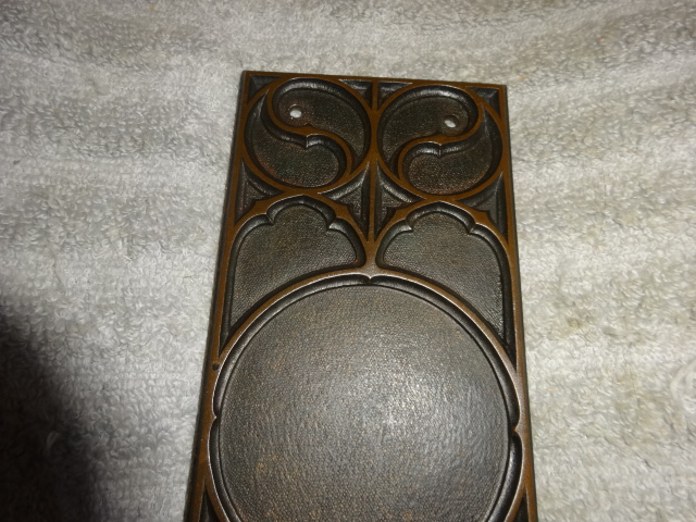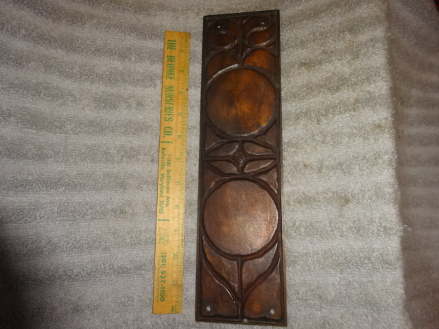 Large heavy bronze push plate in seldom seen pattern retaining original dark bronze finish in amazing condition. Measures 13-1/4” x 3-1/2” Back marked Y&T